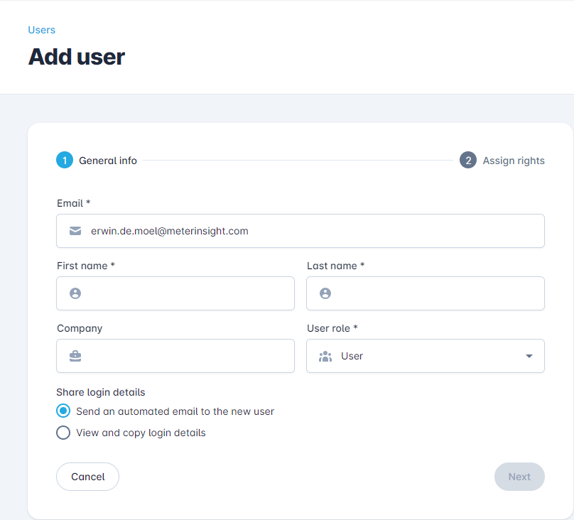 With the "Share login data" selection you can choose how you want to share the login name and newly created password with the new user. The option "View and copy login details" can be useful, for example, if you want to write an accompanying text in the Email yourself.