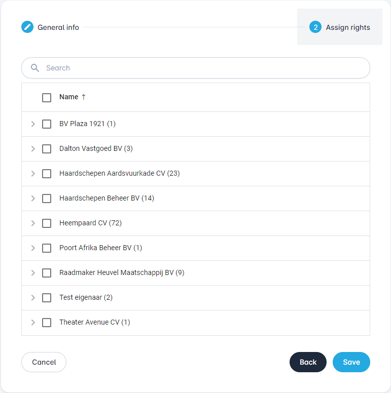 Here you can specify which objects the user has access to. You can select everything, but also make a selection of, for example, certain "Organisations" or "Buildings". The hierarchy you see here depends on your organisation's settings.